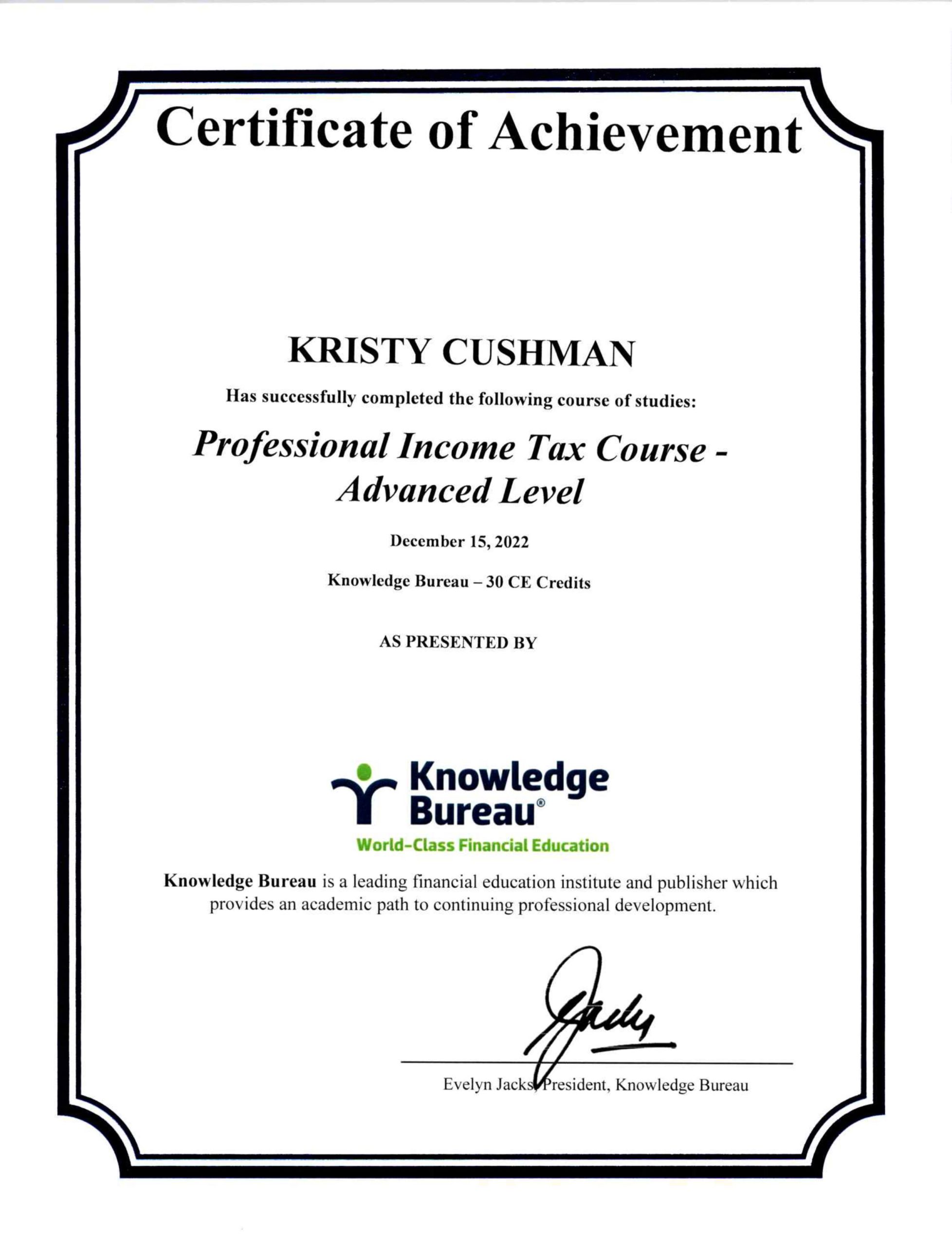 For our most seasoned tax preparers, we offer specialized courses in business, partnerships, international tax, final and trust returns. These courses are taken individually on a self-study basis utilizing one of the advanced courses through the Knowledge Bureau. Most of the time the employees taking these courses get together for study groups, where they exchange ideas and viewpoints.